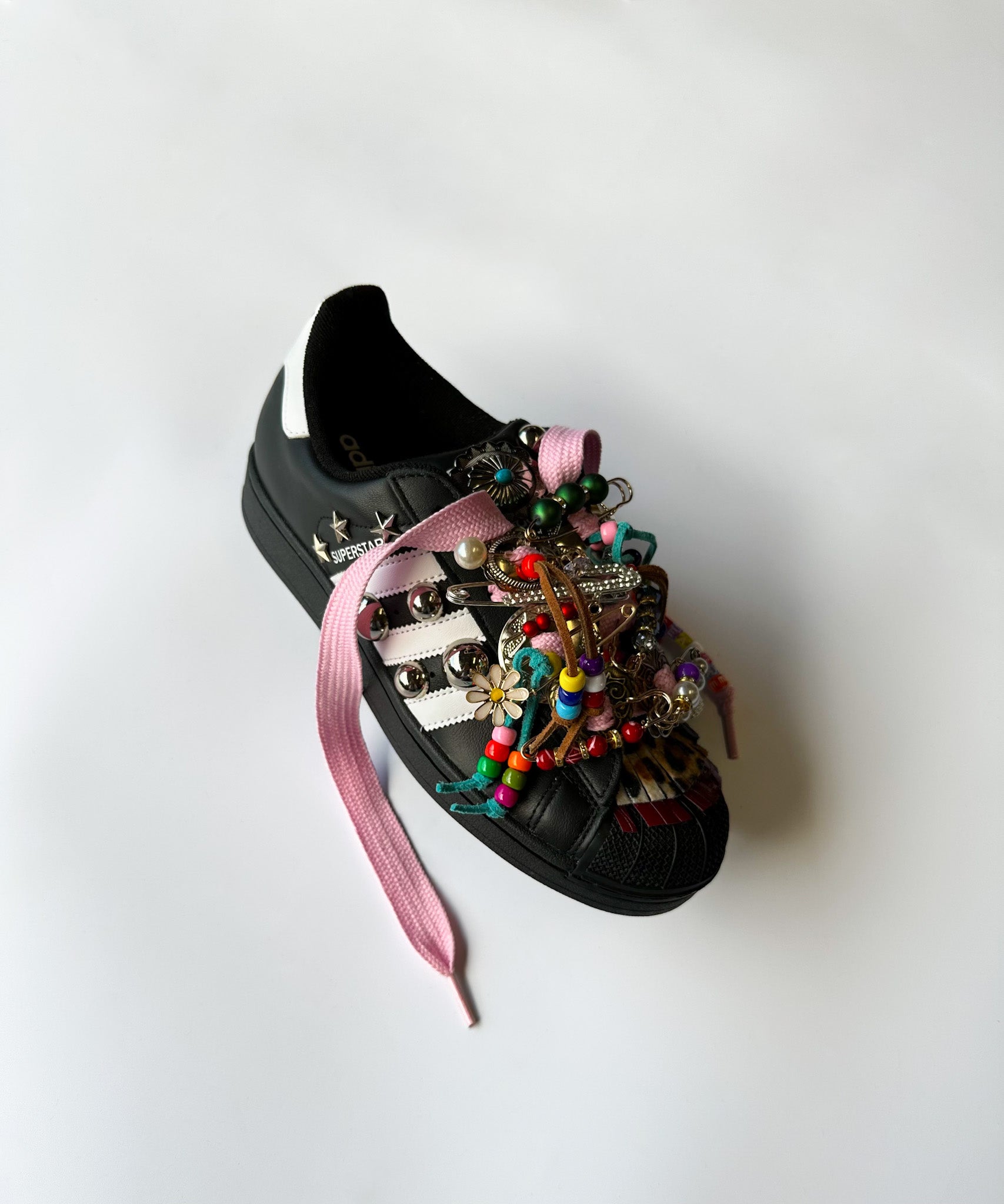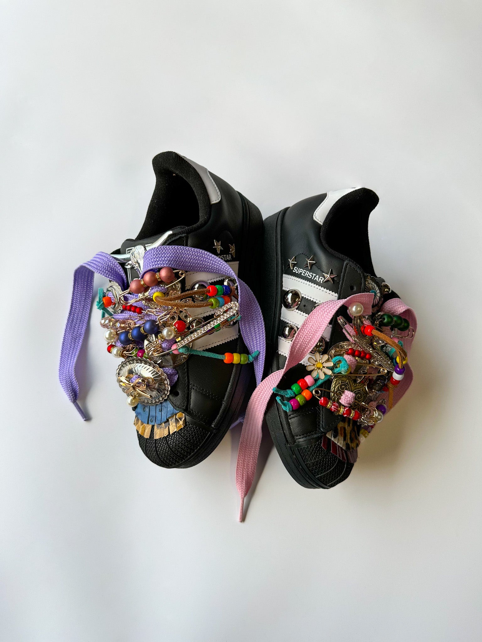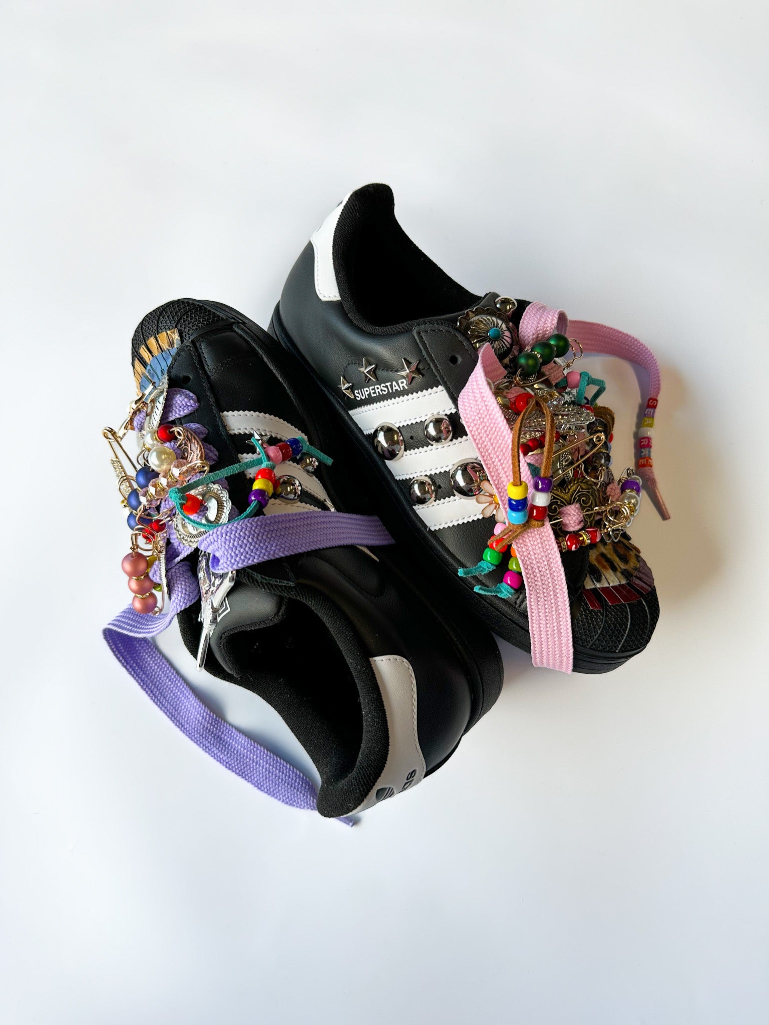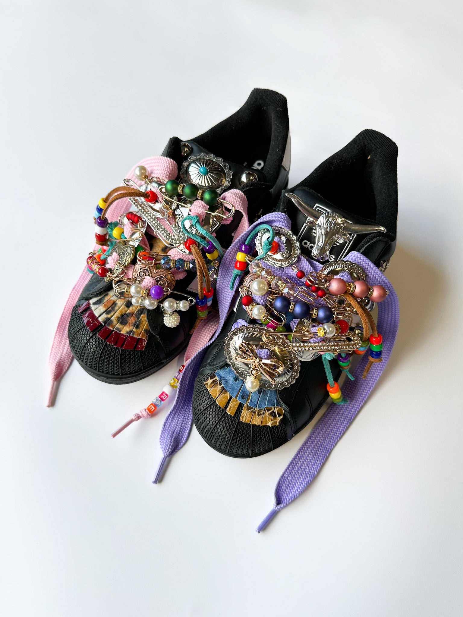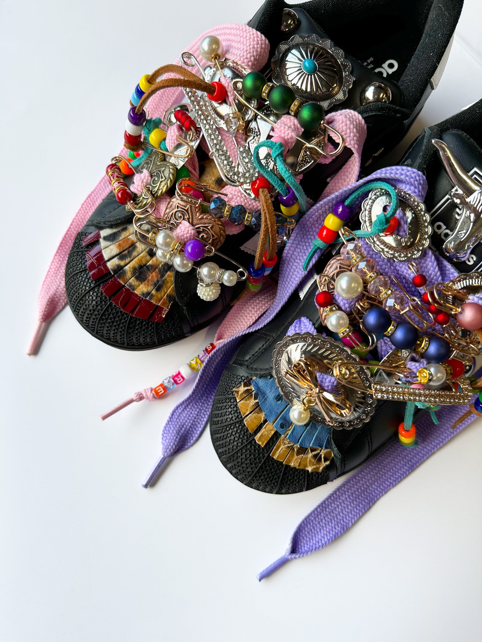 Double layer shoe lace tassels (cowhide/blue ostrich/ red alligator print/cheetah print/snake skin) cut an stitched together. Metal dome head and stars hardware screwed into shoe side panels. Metal western hardware (oval concho/silver bull head) screwed and clasped into upper tongue. Shoe laces fully customized with western hardware and pins!!