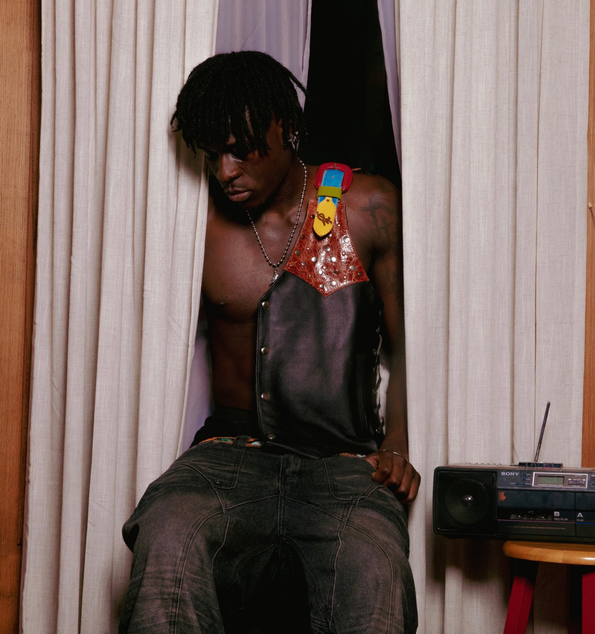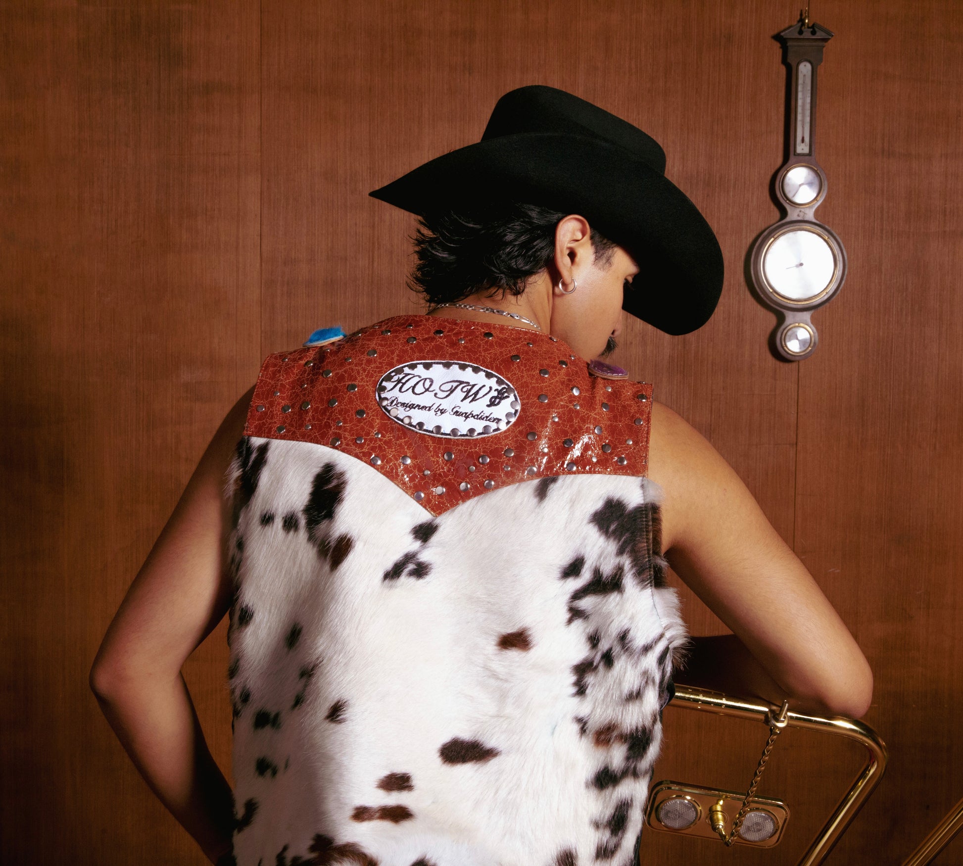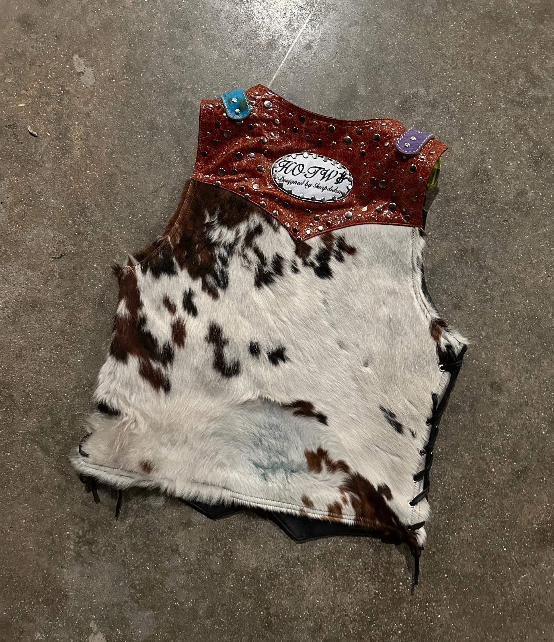 Font of vest is made with classic black leather on bottom with a pocket on each side and red leather on top with a V cut shape with machine pressed silver studs. Back of vest is made with a cowhide on bottom and red leather on top with a V cut shape with a custom patch and machine pressed silver studs surrounded. The shoulder straps are blue and purple cowhide belts adjustable for sizing.