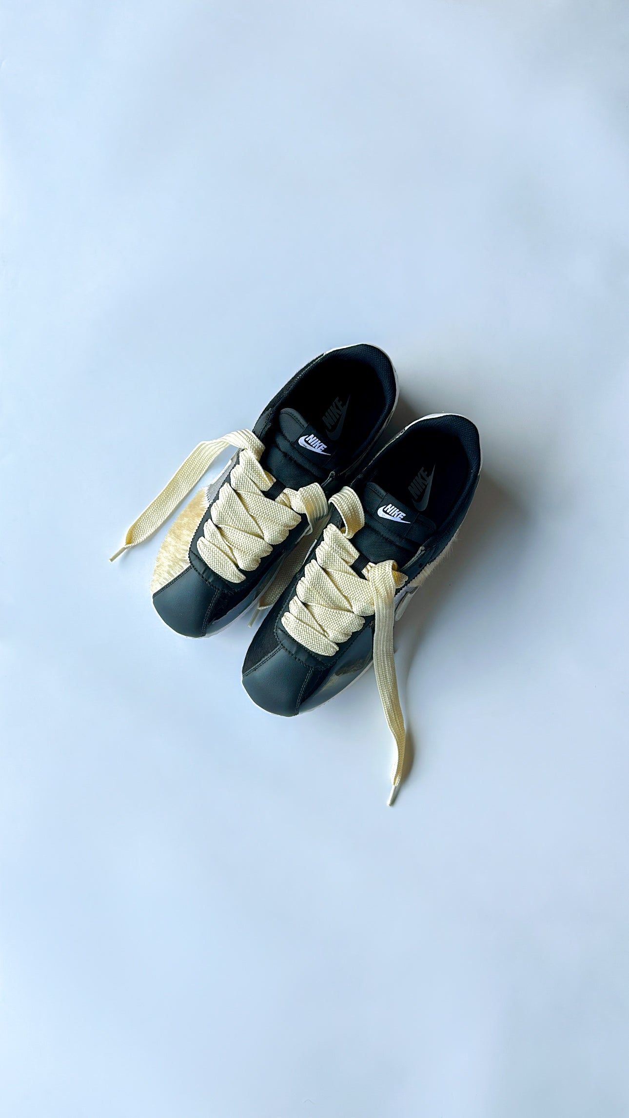 Black & cream pony hair on hide/ black & cream patten leather / black patch-worked leather/ black deer skin leather/silver aged leather handcut to pattern, glued and machine stitched to Nike Cortez canvas with a custom cream patten leather Nike check all materials machine stitched with hi-quality threads, then laced with wide fat flat cream shoe laces.