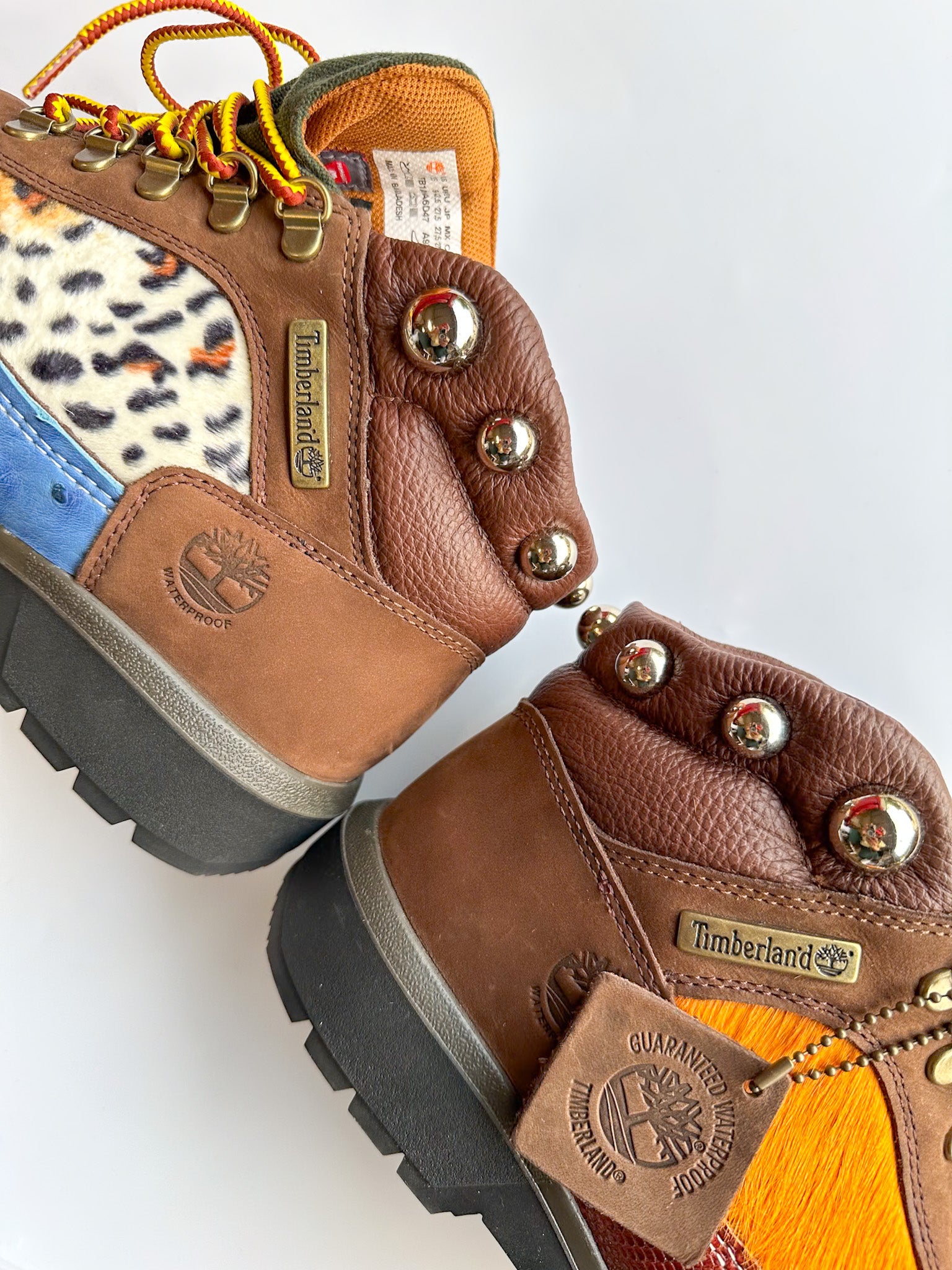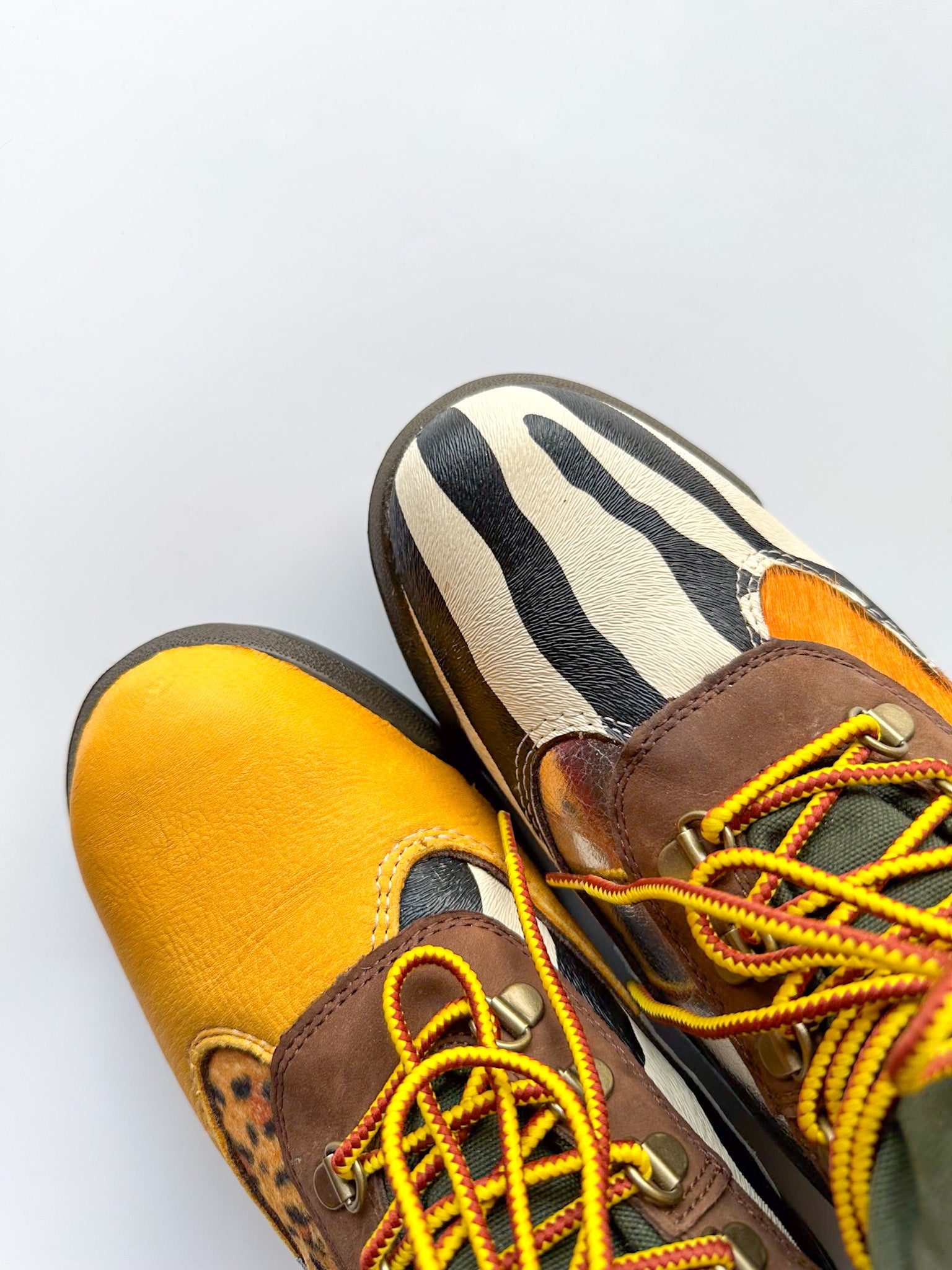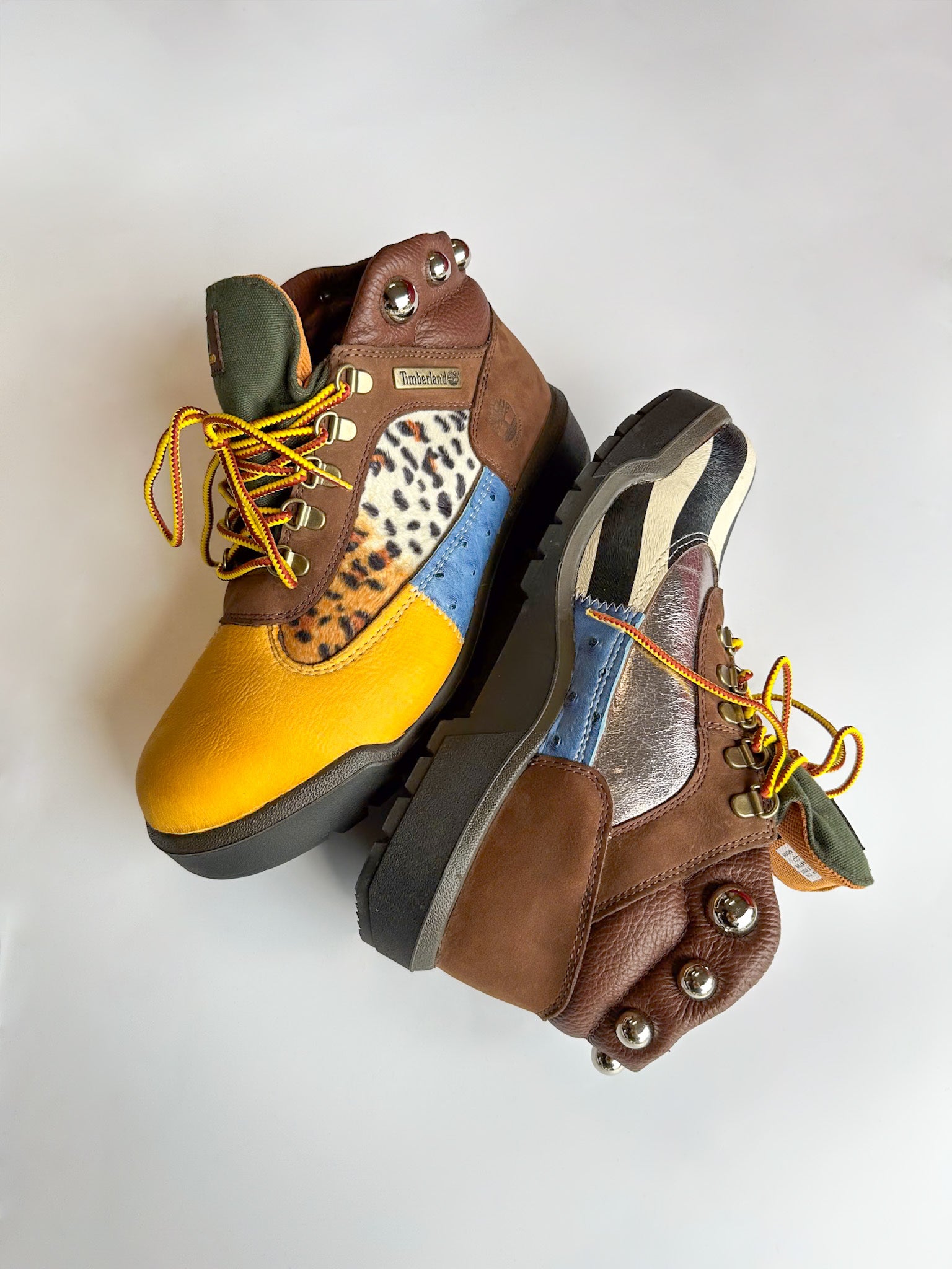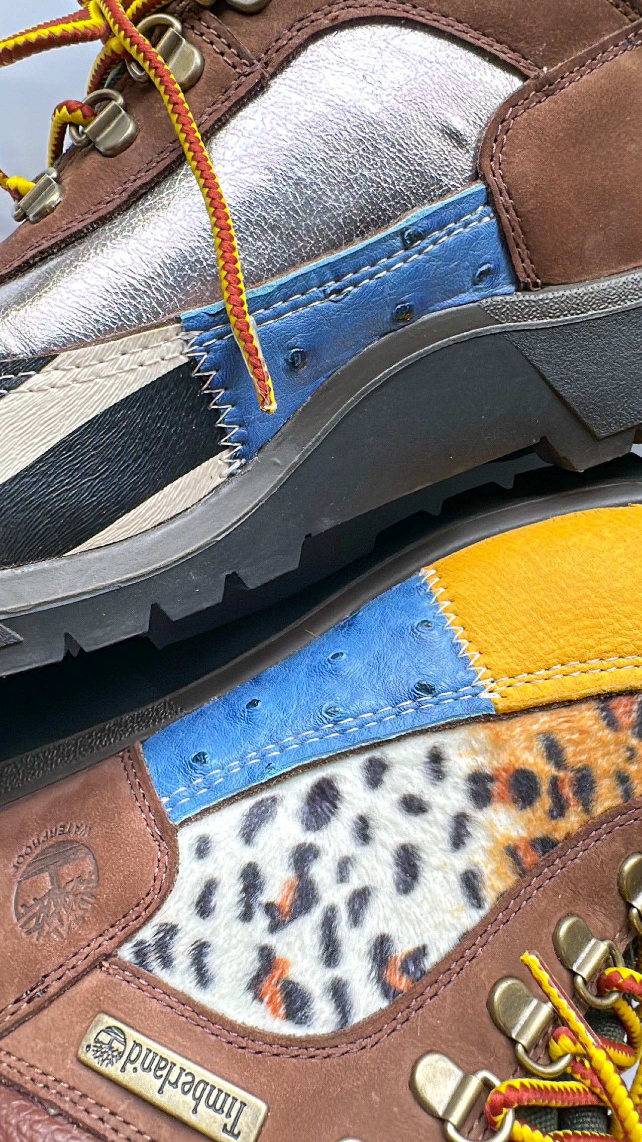 Zebra print/blue ostrich/orange cowhide/silver leather, lizard skin, yellow lamb skin leather and leopard print fabric cut to pattern, glued and machine stitched onto canvas boot! Silver dome studs screwed into uppers(OPTIONAL) and laced with yellow/brown Timberland shoe laces.