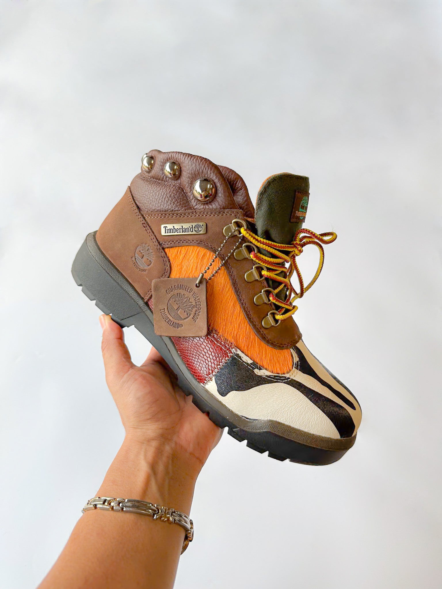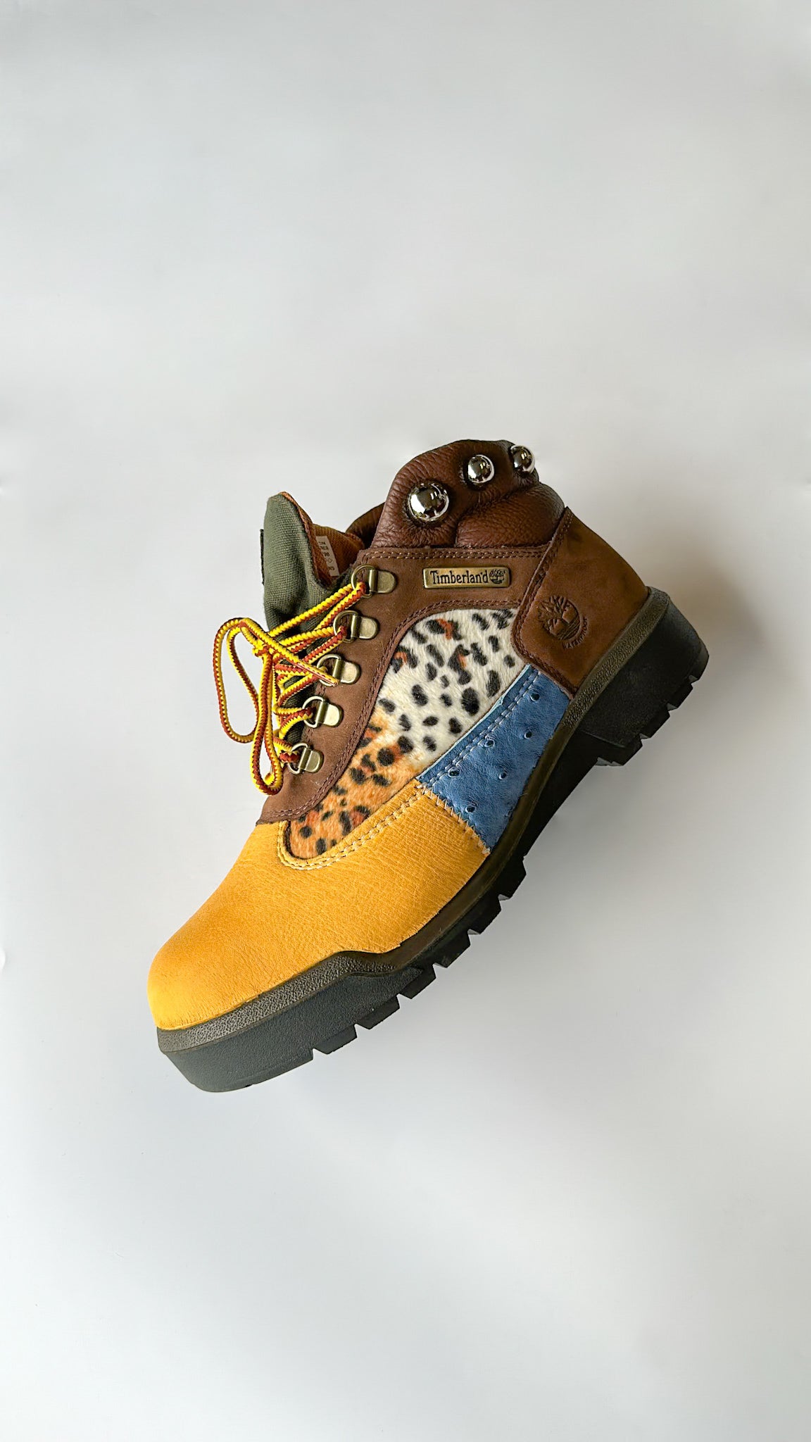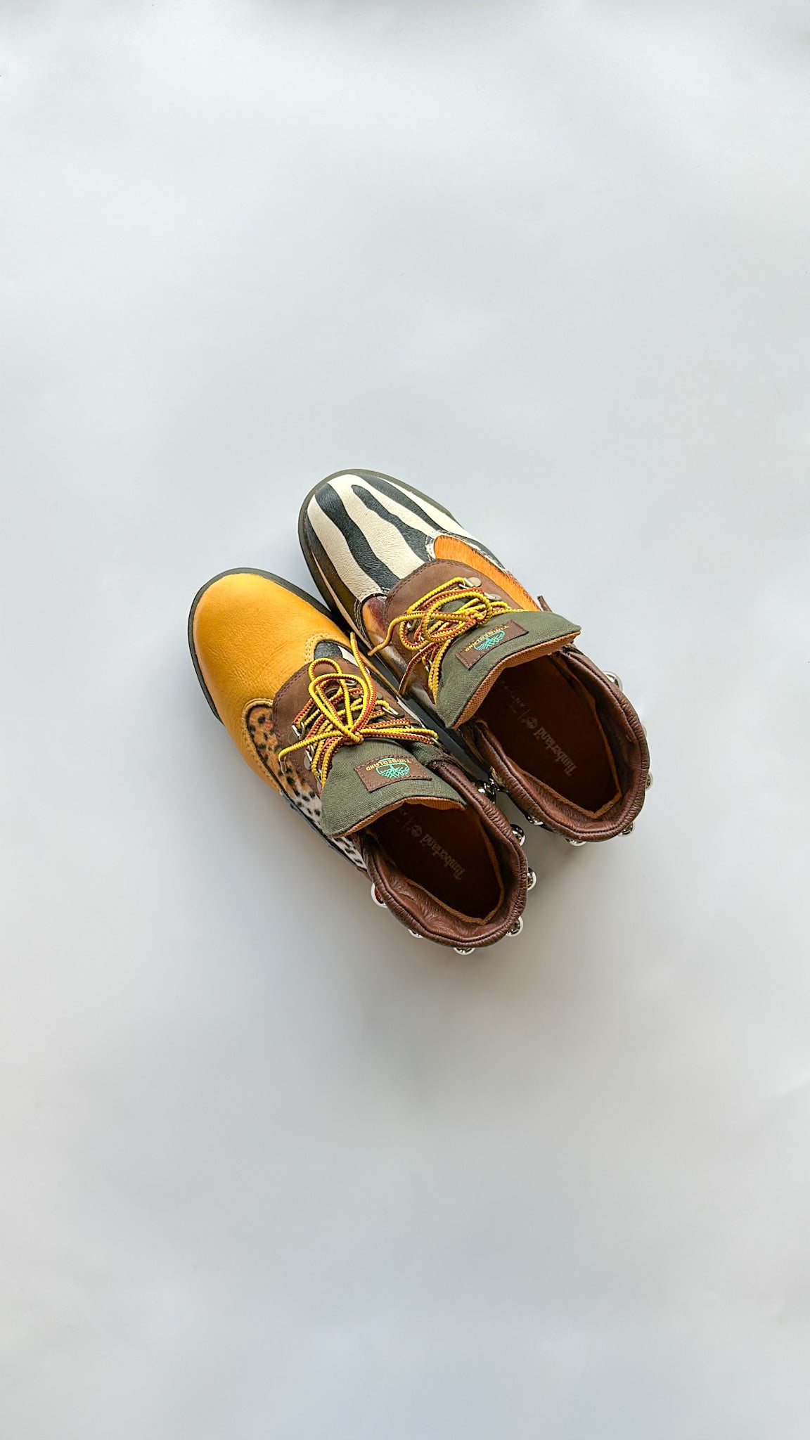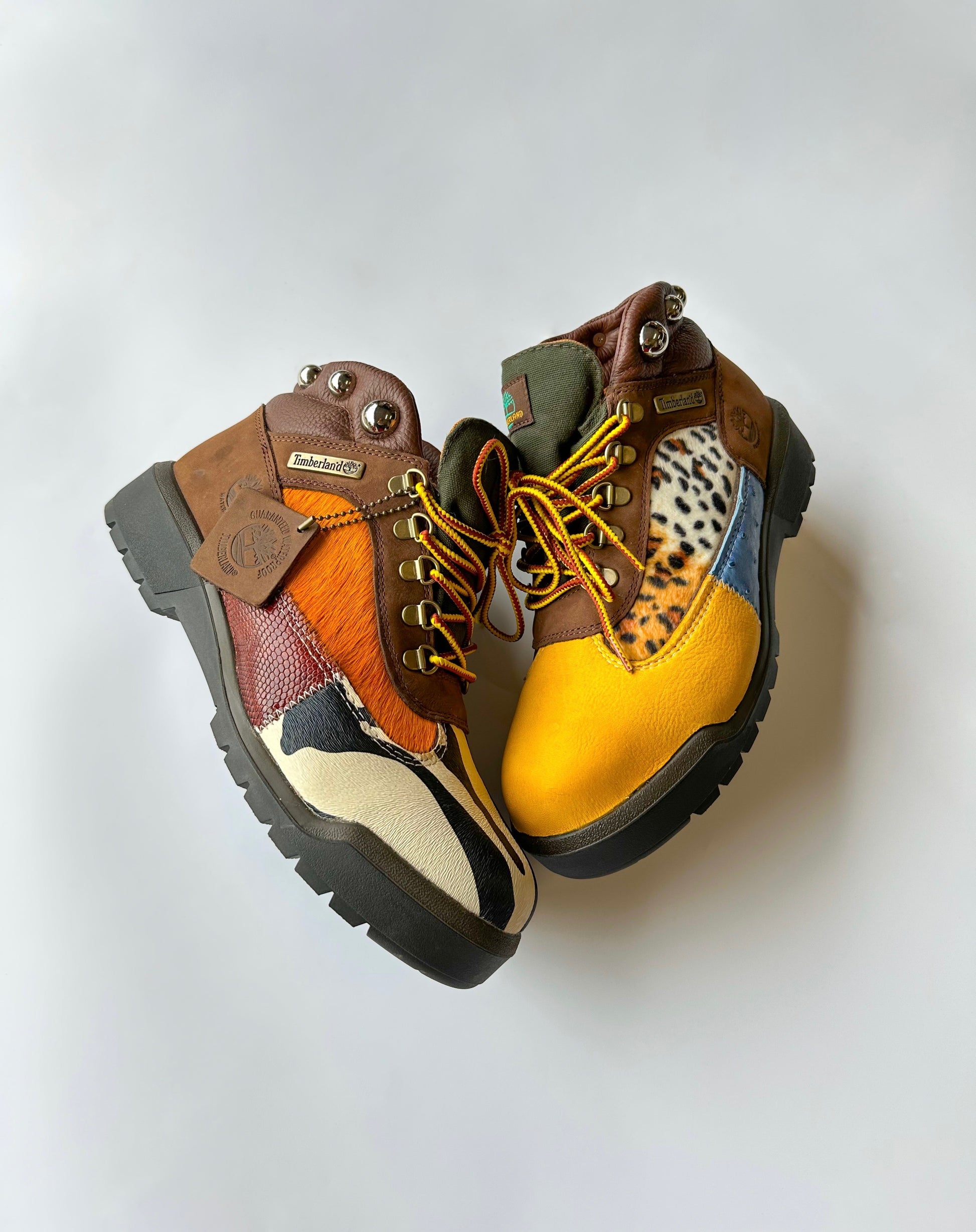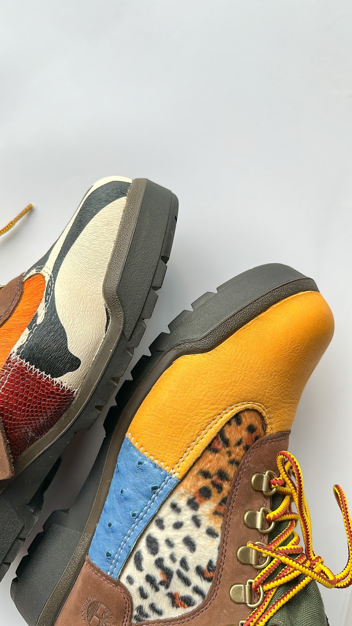 Zebra print/blue ostrich/orange cowhide/silver leather, lizard skin, yellow lamb skin leather and leopard print fabric cut to pattern, glued and machine stitched onto canvas boot! Silver dome studs screwed into uppers(OPTIONAL) and laced with yellow/brown Timberland shoe laces.