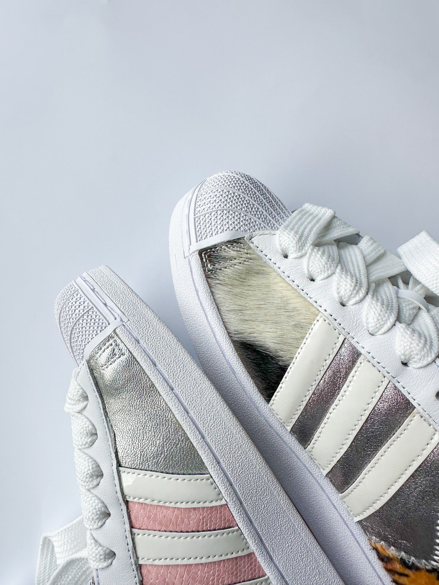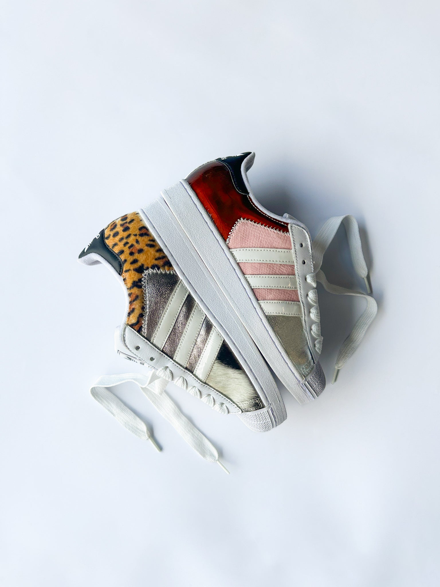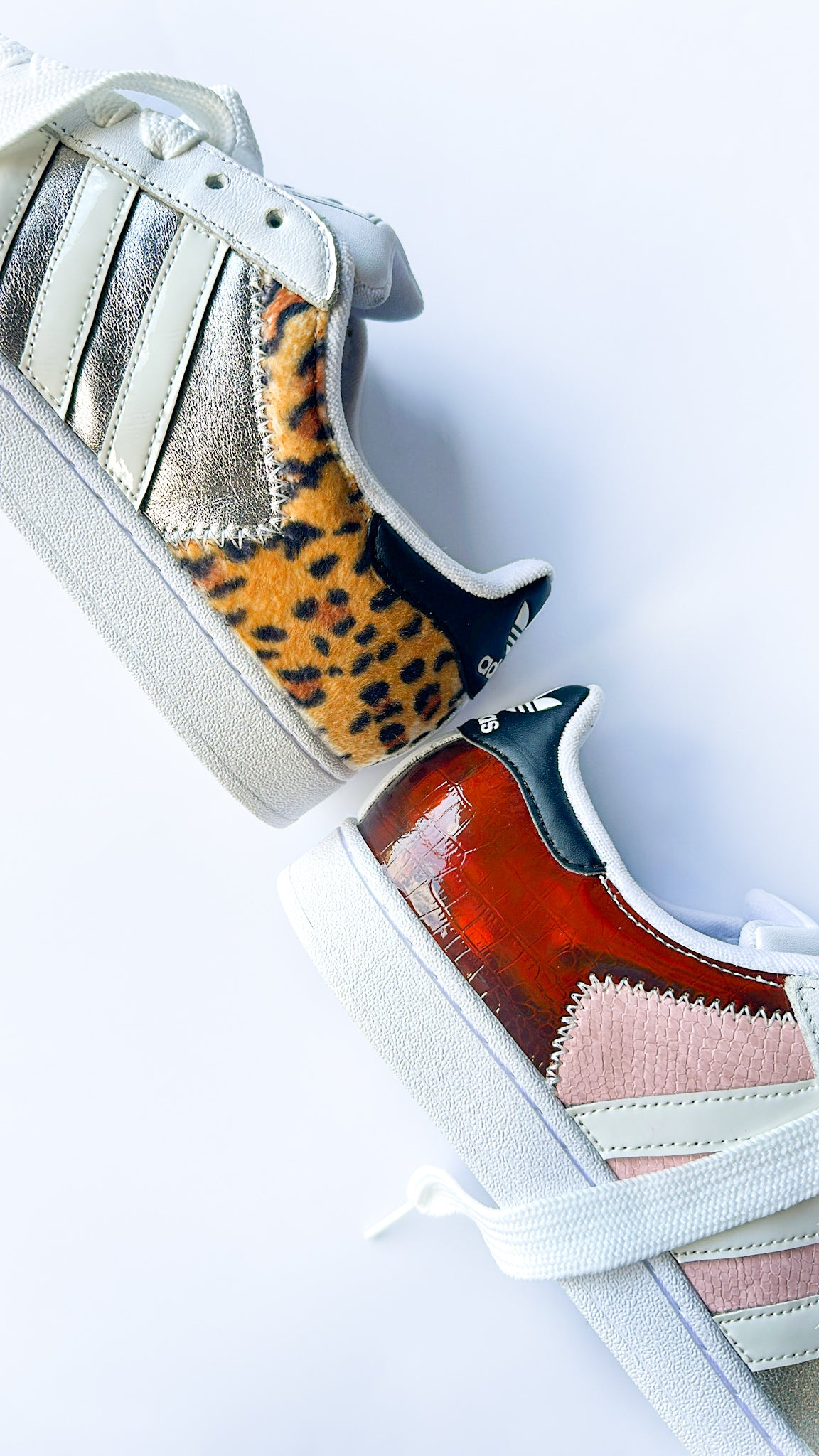 Right outside panel has silver leather/pink snakeskin/wine red patent leather. Inside right panel has brown snake skin/metallic snakeskins/silver leather cut clued and machine stitched. Left outside panel has cowhide/silver leather/cheetah print fabric. Inside leather panel has pink snakeskin skin/red leather/silver leather cut, clued and machine stitched. Both shoes including custom white patent leather Adidas stripes, finished and laced with fat flat white jumbo shoe laces.