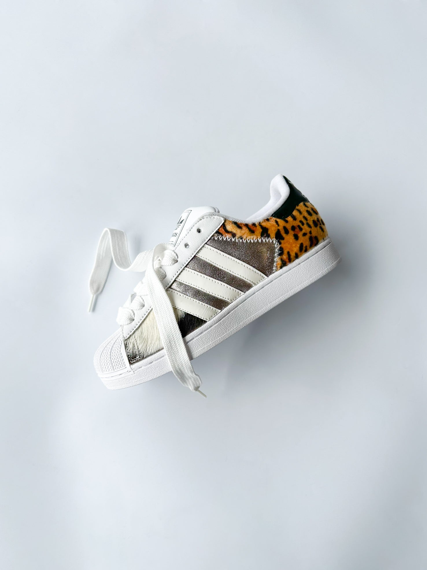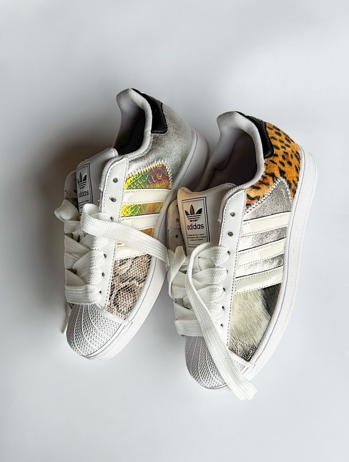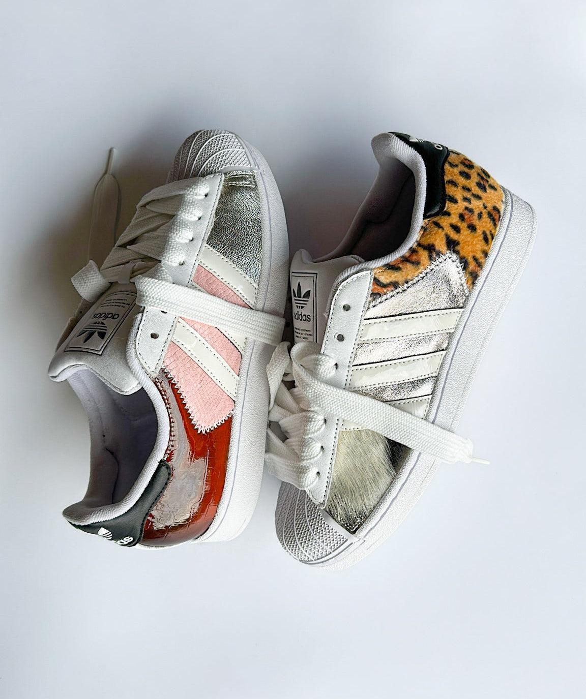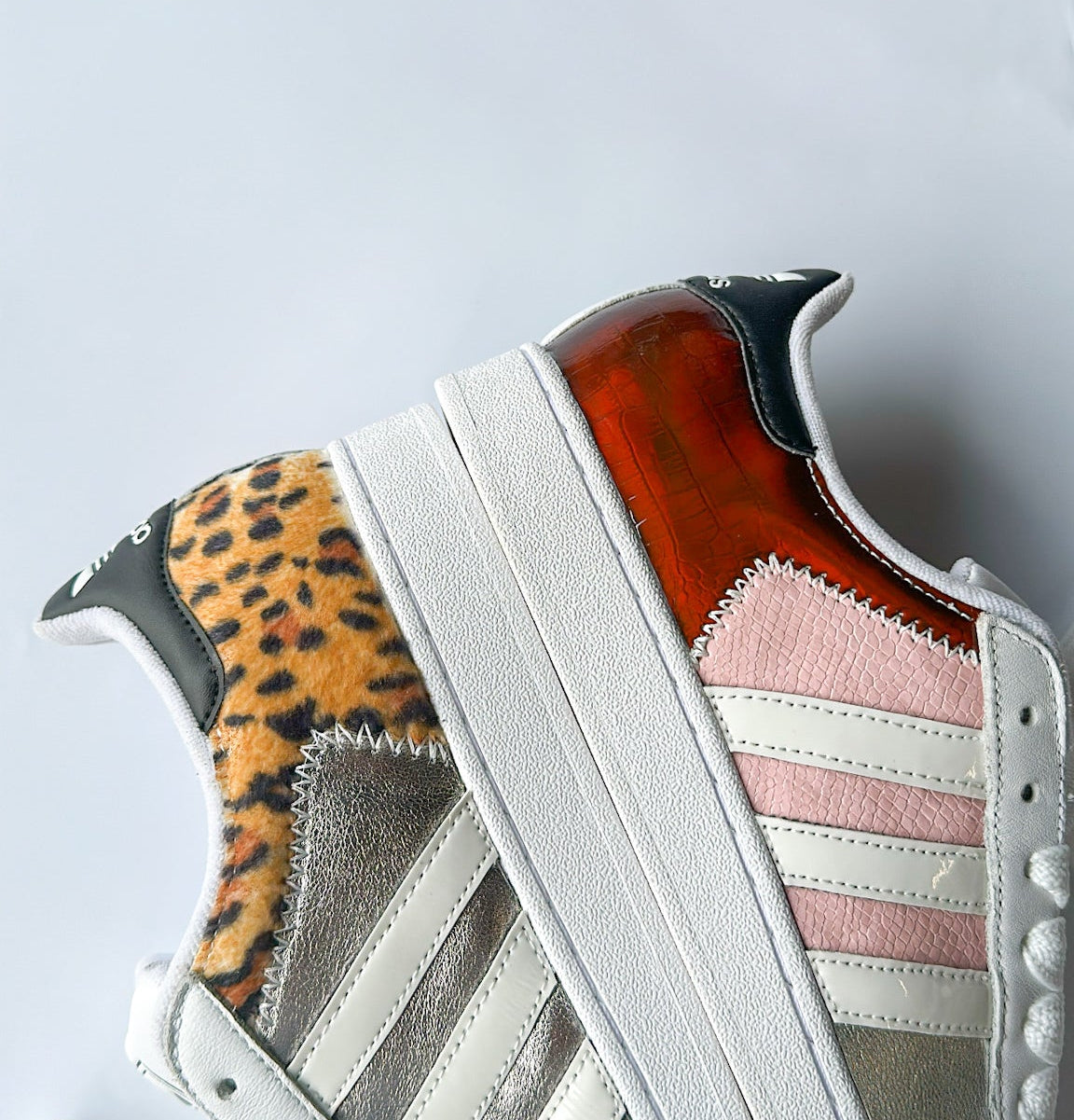 Right outside panel has silver leather/pink snakeskin/wine red patent leather. Inside right panel has brown snake skin/metallic snakeskins/silver leather cut clued and machine stitched. Left outside panel has cowhide/silver leather/cheetah print fabric. Inside leather panel has pink snakeskin skin/red leather/silver leather cut, clued and machine stitched. Both shoes including custom white patent leather Adidas stripes, finished and laced with fat flat white jumbo shoe laces.